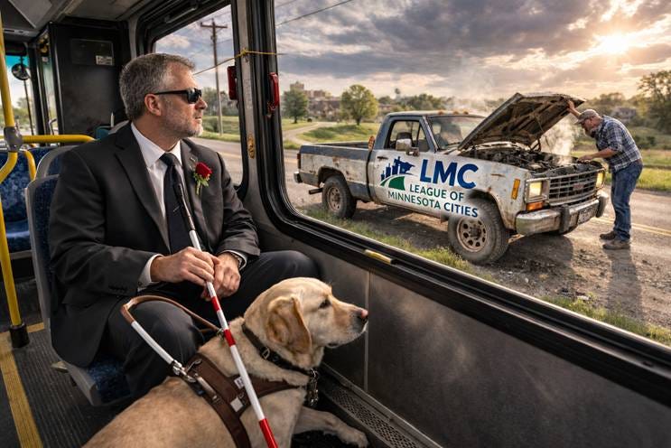 Image Description: A middle-aged man in a dark suit with a red rose boutonniere sits on a city bus holding a white cane, with a guide dog at his feet. He looks out the window at a rusty pickup truck labeled “LMC – League of Minnesota Cities” broken down on the roadside, its hood up and smoke rising as a man examines the engine under a dramatic sunset sky.